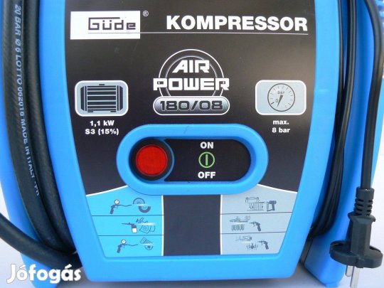 A Güde 50077 Airpower 180/8 megbízható olajmentes kompresszor 1,1 kW-os villanymotorral. 140 l/perc fújási teljesítményével ideális választás gumiabroncsok, labdák és matracok felfújásához.