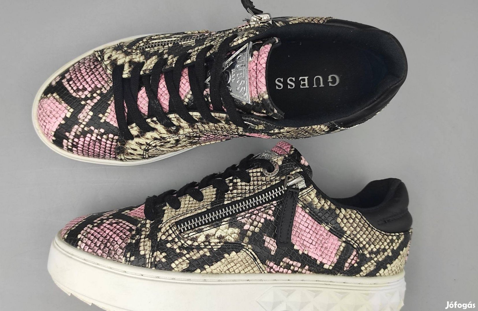 Keveset használt, szép állapotú Guess kígyóbőrmintás sneaker. Cipzárja csak dísz, nem nyitható! Felsőrésze eco bőr, belül textil bélése van, kivehető talpbetétje. Masszívabb darab, súlya 900 gramm/pár. A világos talpéle hátul picit elszíneződött, de más hibája nincsen.