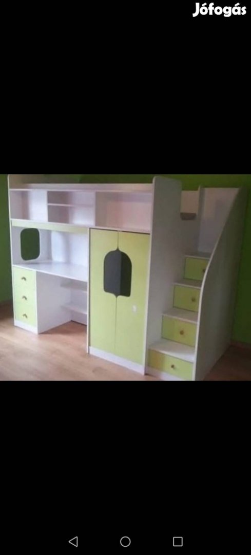 Gyerek ágy, iróasztallal,lépcsős fiókokkal,baloldalt kis szekrénnyel,ágy alatt kis játszóhellyel.
