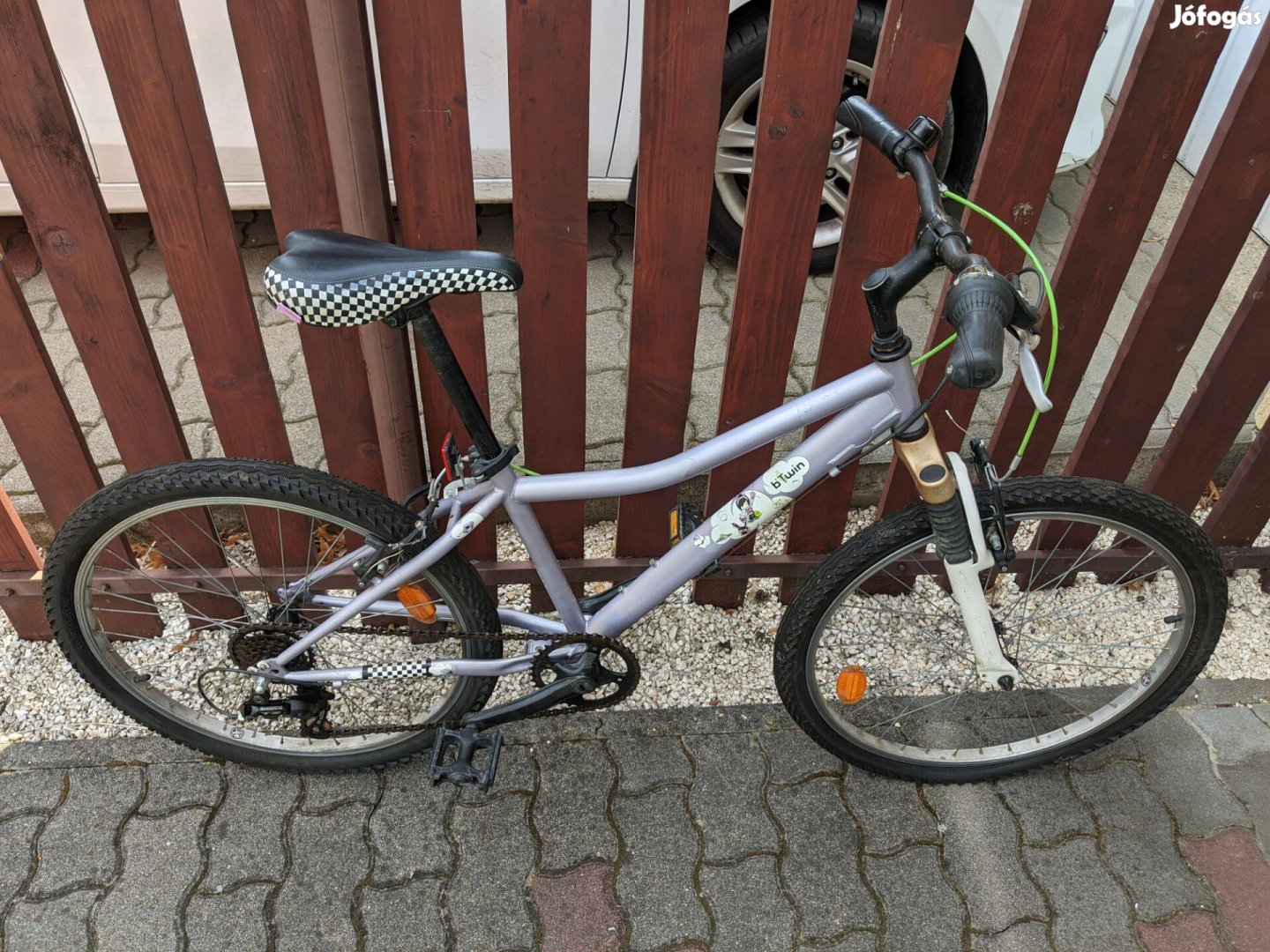 Jó állapotú gyerek bicikli, ezüstös-lila színben; a lánc, fék szerkezet frissen van olajozva, a váltó jól működik.
