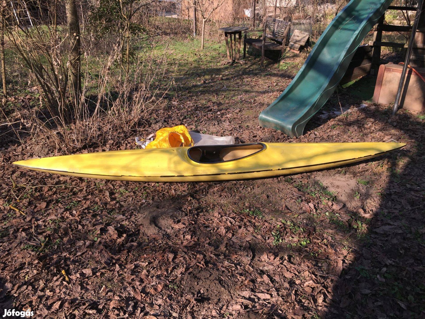 Üvegszálas, gyerek/ifi (~8-14 év) kajak költözés miatt eladó. A korának megfelelő állapotban, kissé karcos, de tökéletesen működik. Hossza 360 cm, beülőnyílása 36,5 cm széles. Elől-hátul légzsákkal, aluminium vadvízi evezővel és egy hullámköténnyel. Az ár fix ár.