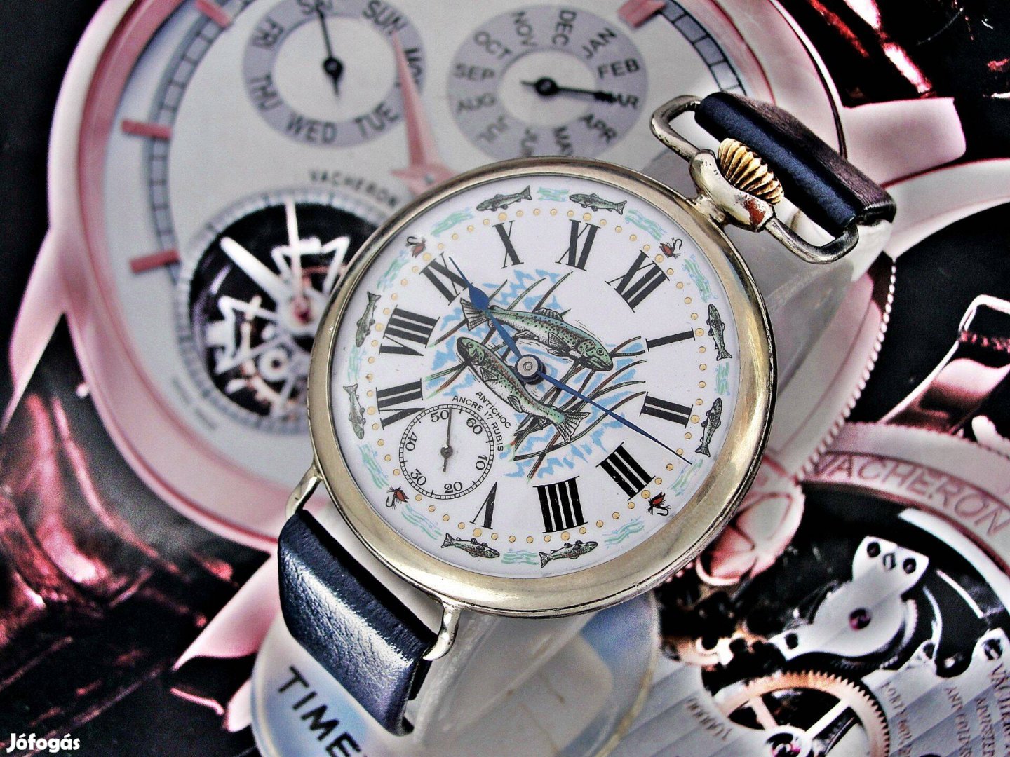 Ez a konkrét óra egy igazán különleges és látványos példája ennek a világnak. A gyönyörű porcelán számlapot egyedi halak motívum díszíti, amely ritka és figyelemfelkeltő megjelenést kölcsönöz az órának. A számlap finom kidolgozása és a szép, korhű mutatók harmonikus összképet alkotnak, amely egyszerre elegáns és karakteres. A szerkezet egy minőségi, hattyúnyakas finomszabályzóval ellátott mechanika, amely az korabeli 1910-1920-as évek óragyártás magas színvonalát tükrözi, és ma is megbízhatóan működik.