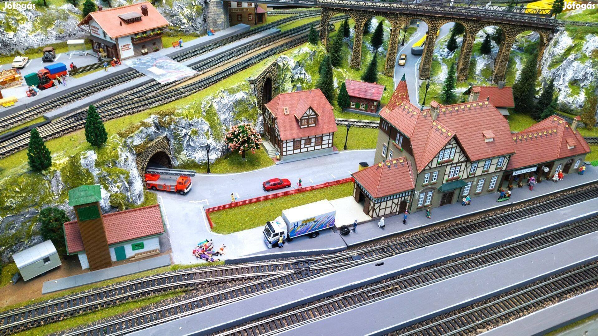 Roco profi 2,5 mm H0 sínekből épült igényes anyagokkal, négy körös átjárható pályával. Külső utakon és az épületekben led villágításal. A terepasztalon 10db elektromosan állítható váltó van. asztalból kicsúszó fiókban kapcsolható elemekkel. A Digitális vezérlő Roco Z 21 mausal. 6 db kb. 55 cm magas lábon áll az asztal. Az asztalhoz gördülő anyag nem jár ,egyedi megbeszélés alapján tudok biztosítani.