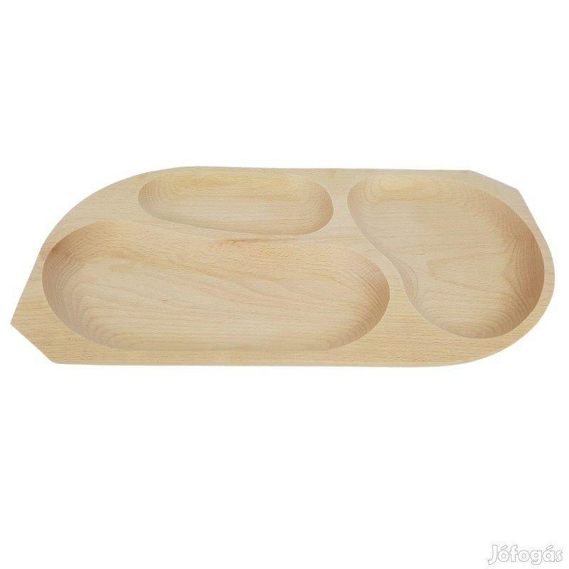 Bükkfából, hármas osztású nagyobb méretű fatányér, kínáló tál 43 × 23 cm-es méretben