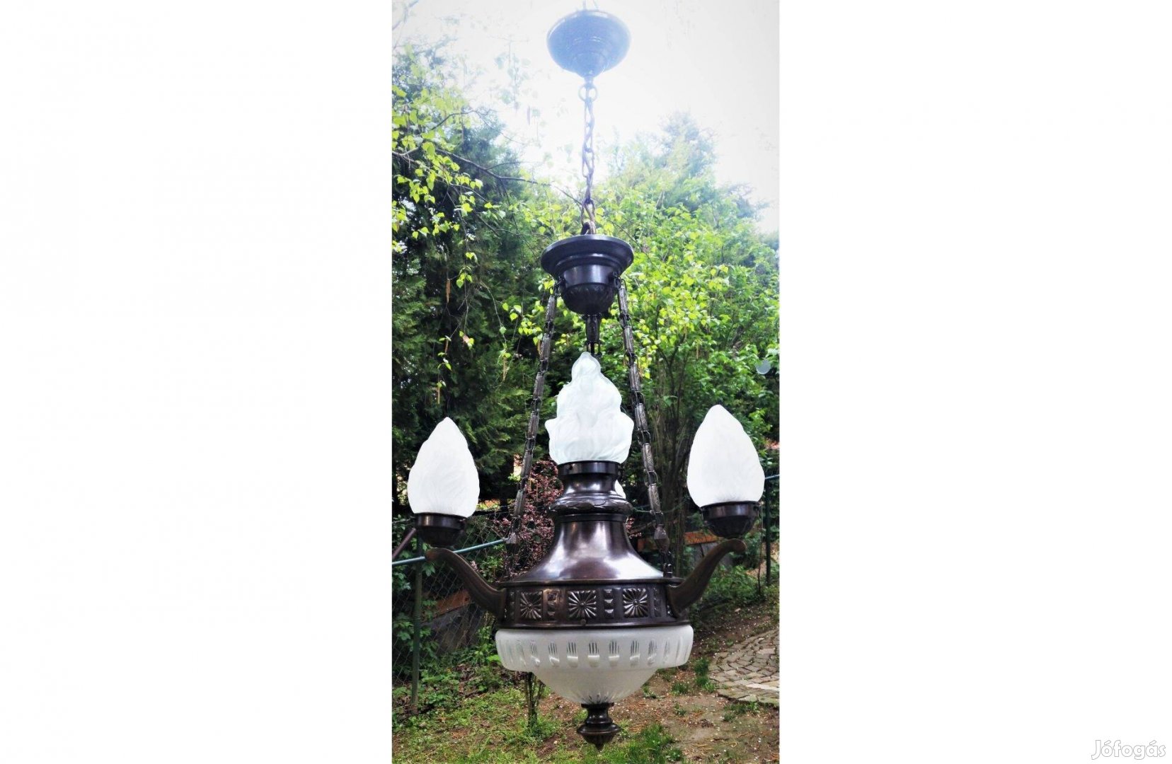 Három karú, 5 égős artdeco bronz csillár, felújított. Magassága 72 cm + 35 cm lánc és mennyezetrózsa, szélessége 54 cm.