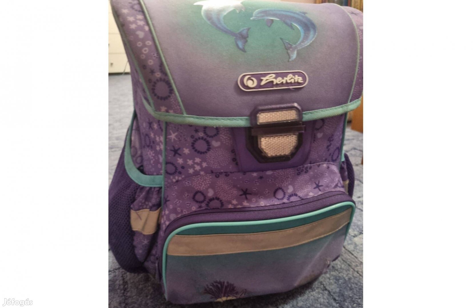 Eladó használt Herlitz lila delfines iskolatáska elsős/másodikos kislánynak. Hátulja merevített, ergometrikus, jól szellőző hátkialakítás, akadálymentesen állítható vállpántok, állítható mellkaspánt, megerősített alsó panel, klikk-zár, fényvisszaverő rátétek.