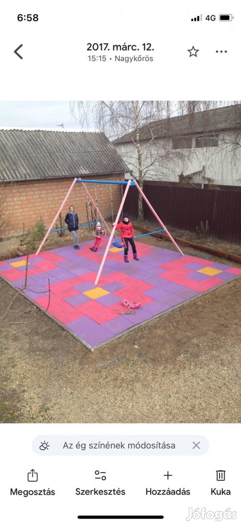Eladó a képen látható 6*5 méteres játszótér gumilappal, hintával, az összes tartozékával együtt. Érd: