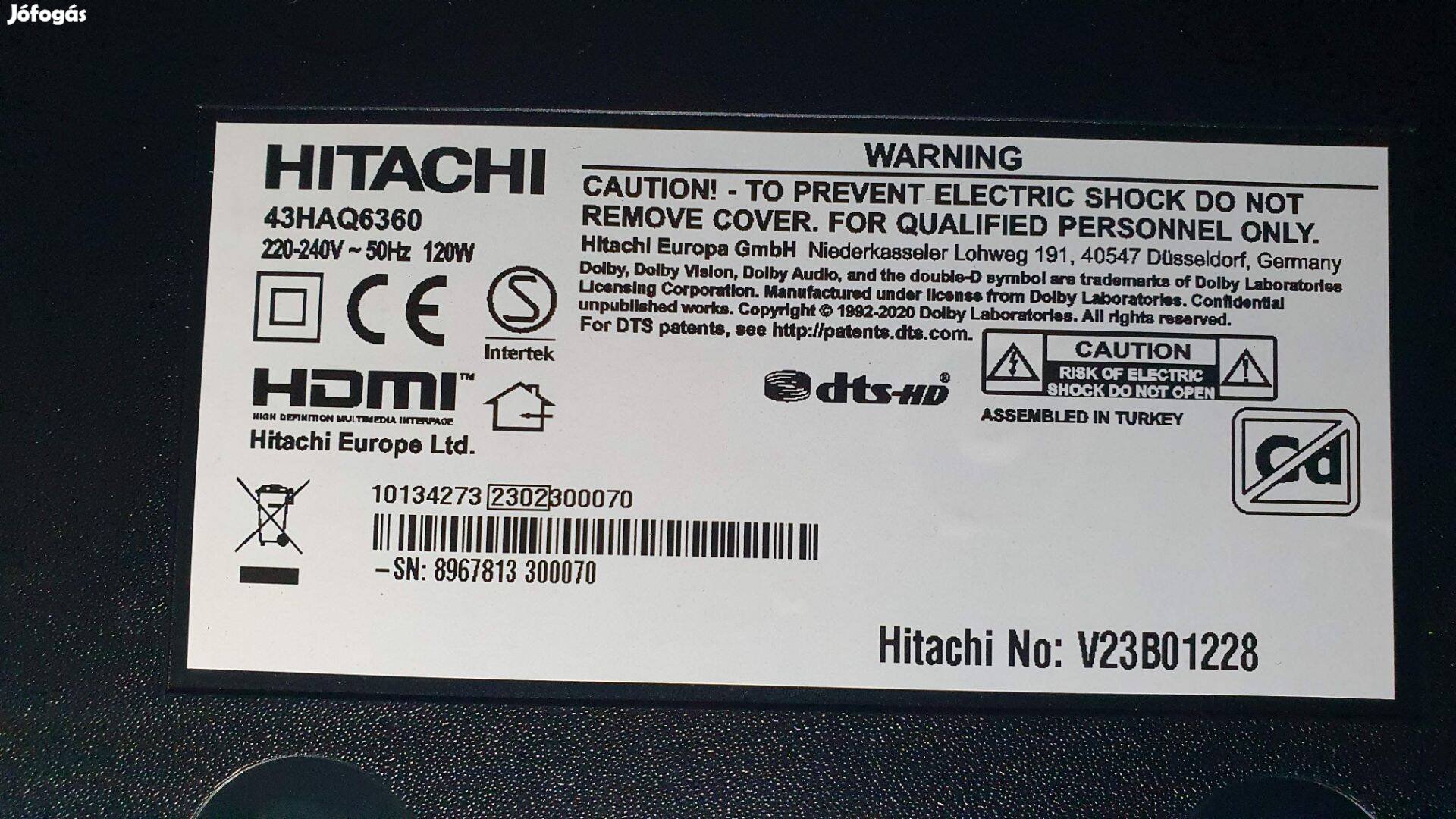 Hitachi 43Haq6360 LED LCD tv hibás törött alkatrésznek eladó