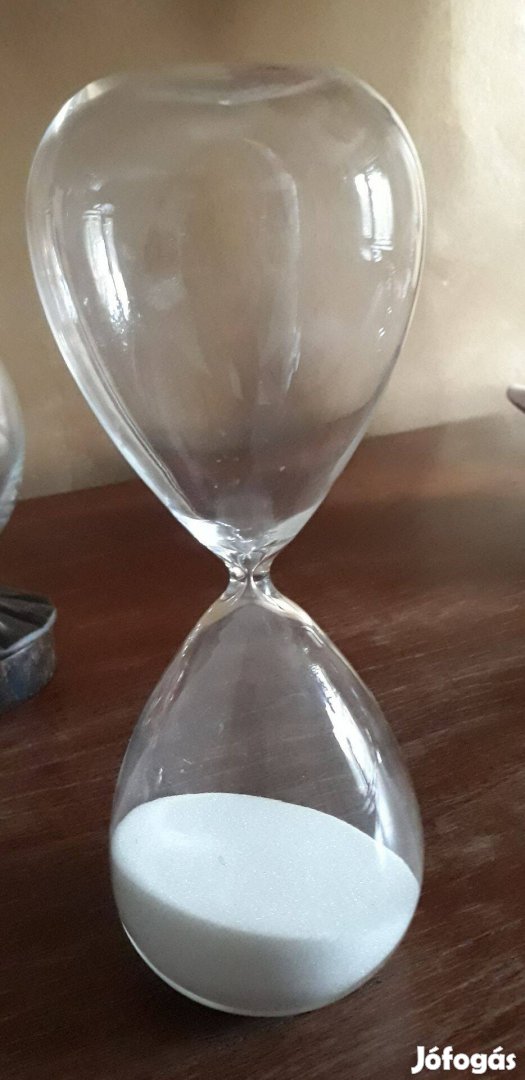 Vékony fújt üvegből készült, de biztos talpon álló időmérő alkotás.