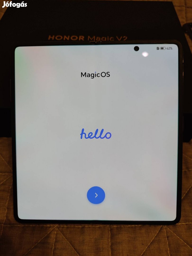 Eladó Honor Magic V2 lila telefon, 512-es belső tárhellyel. Szinte makulátlan a mobil! A zsanér színezett részén van 2 aprócska hajszálkarc, ami a működésében nem gátolja. A külső kijelzőn (karcmentes) egy 200 mikronos Shieldup szilikon fólia van, ami egy általános üvegfóliának felel meg védelemben. A belsőn nincs védőfólia, csak a gyári speciális fólia, ami szintúgy új állapotú. A B-teltől vásároltam tavaly tavasszal 3 év garanciával.