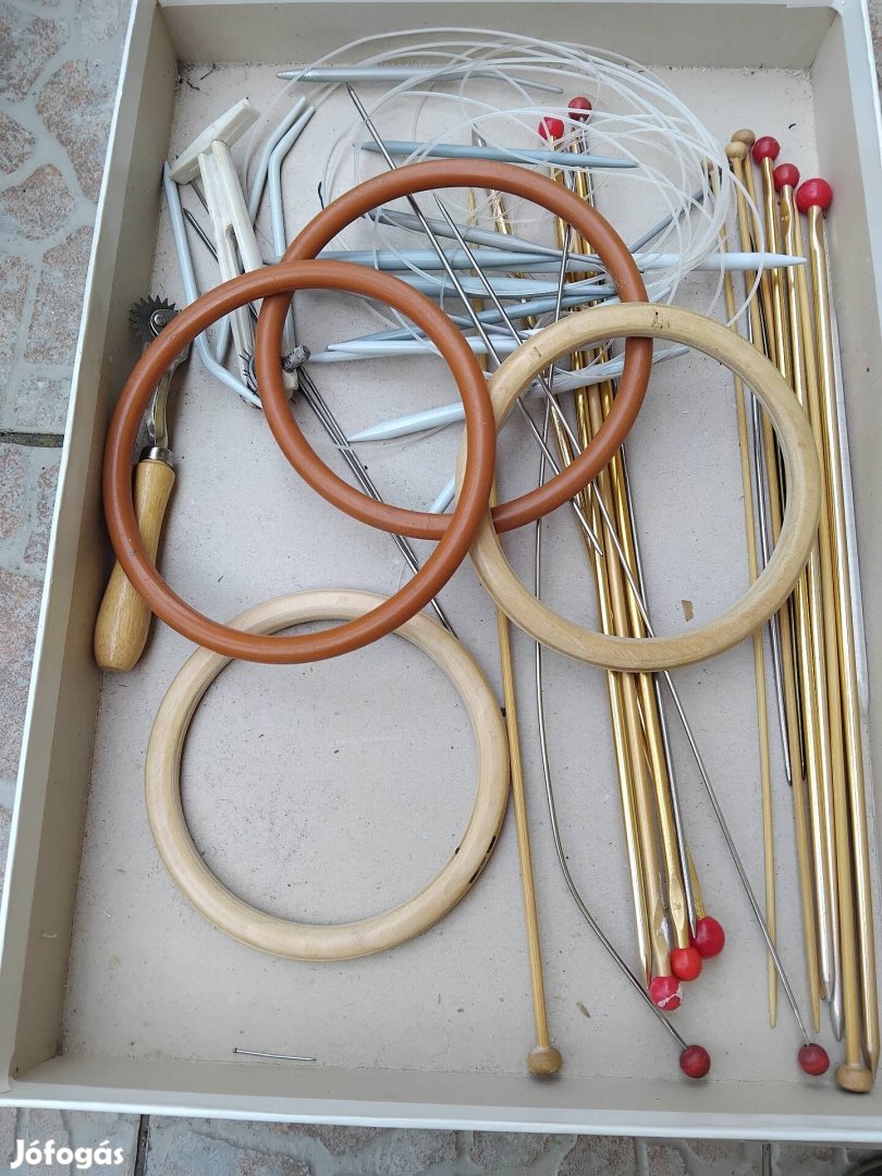 A képen látható horgolashoz és kötethez kellékek egyben eladók