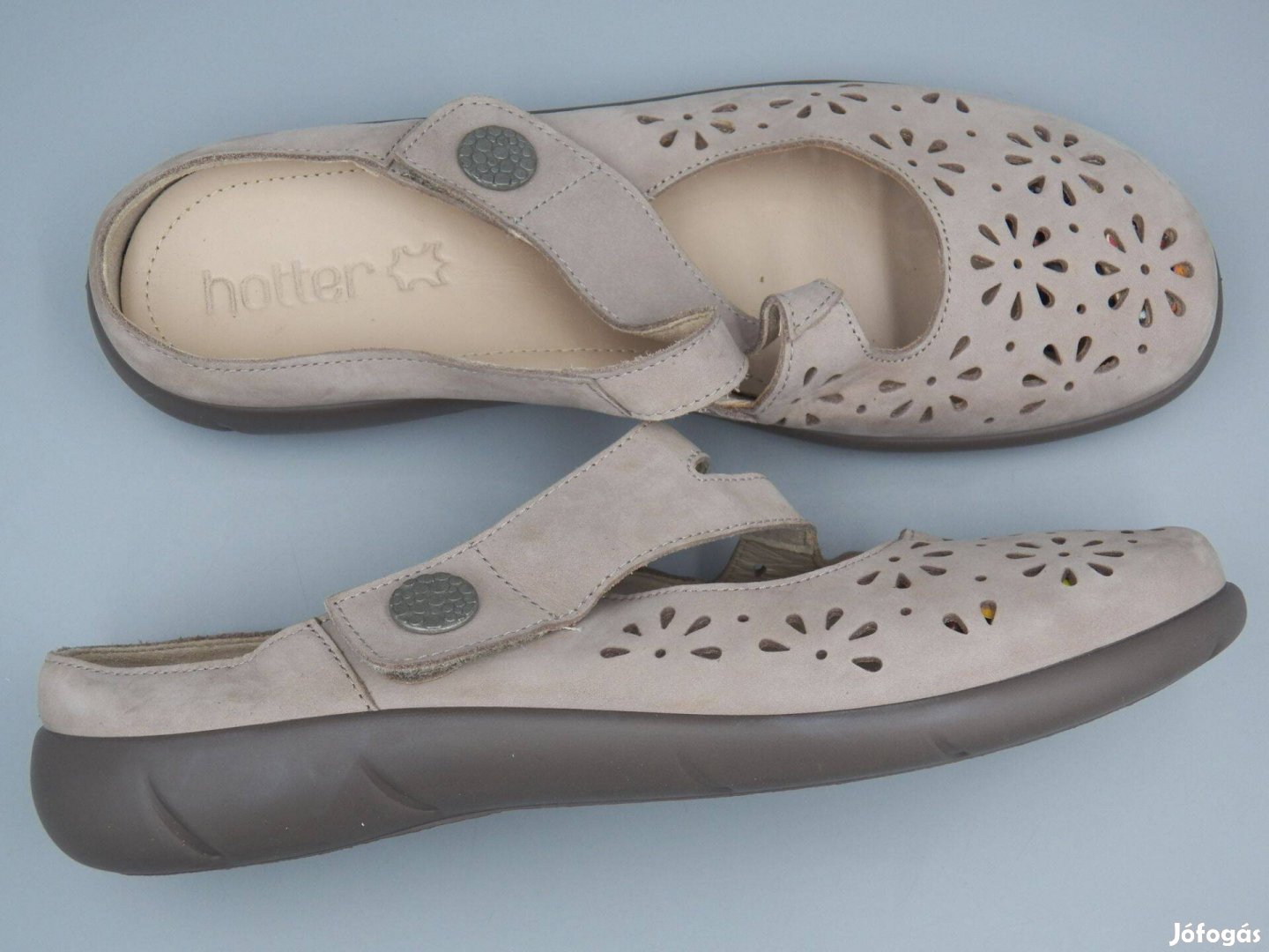 Újszerű állapotú Hotter angol bőr papucs cipő. Felsőrésze nubuk bőr, kivehető talpbetéte szintén bőr. Lyukacsos fazonú, pántja tépőzáras. Kényelmes, csinos darab..