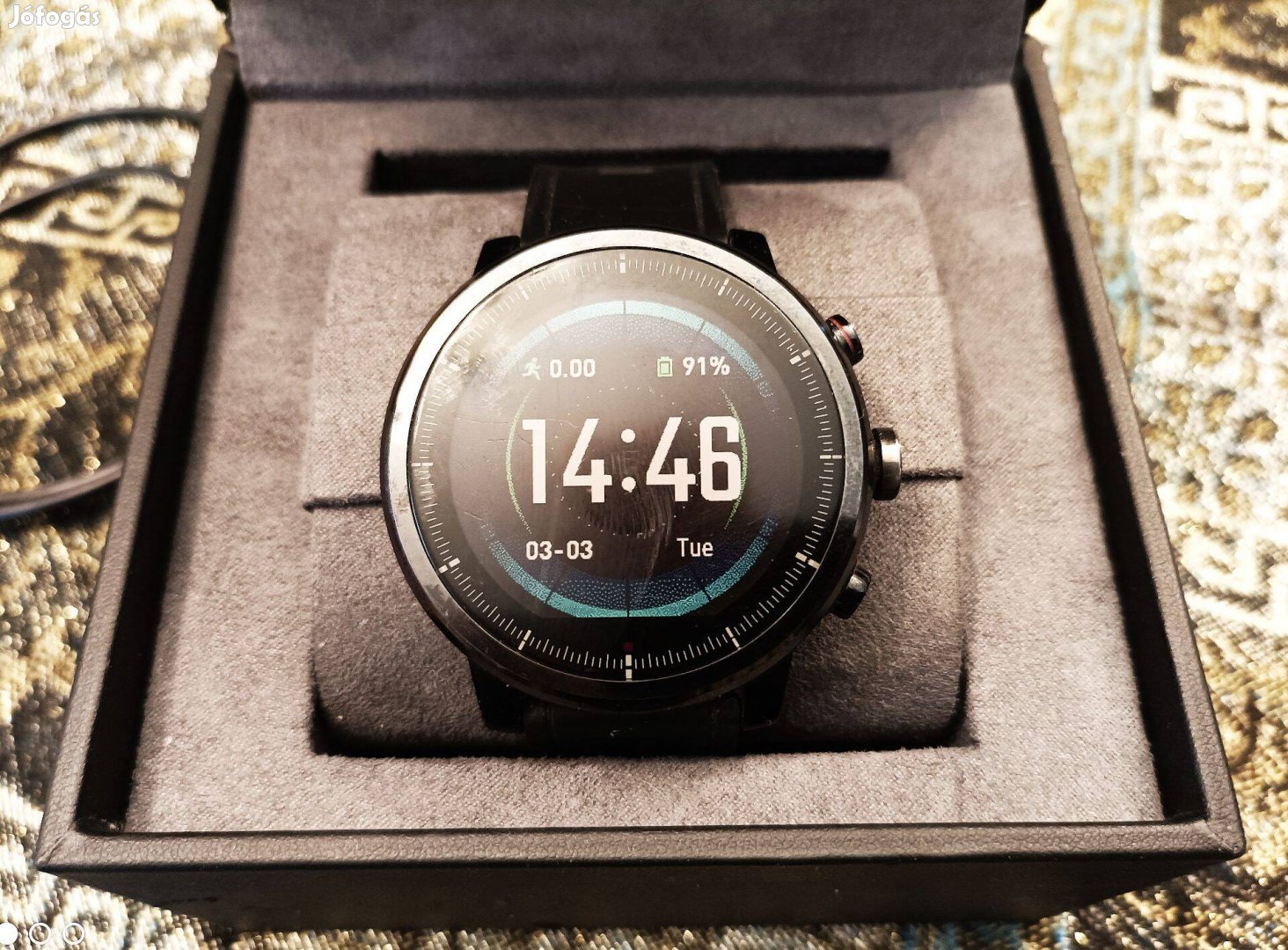 A doboz enyhény kopott, de a belső része hibátlan, bársony borítású. Nem használt plusz szíj, és új töltő dokkoló.