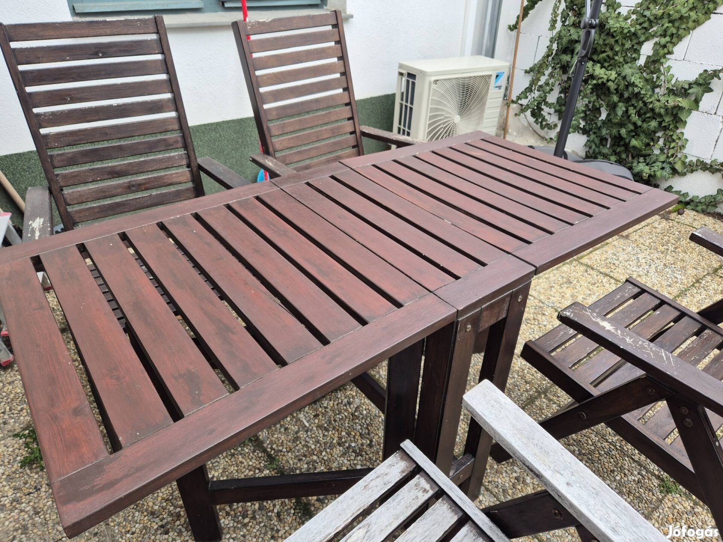 IKEA Applarö fa kerti bútor szett eladó.Egy kihajtható asztal és 4 hátradönthető szék.Az asztal szép állapotban van, a székek viszont festést igényelnek.El is kezdtük az egyiket lecsiszolni,de kisebb szettre váltunk,így a festést már nem kezdtük el.Egy kis törődéssel értékes,időtálló bútor lehet. Személyesen elvihető Pilisborosjenőről.