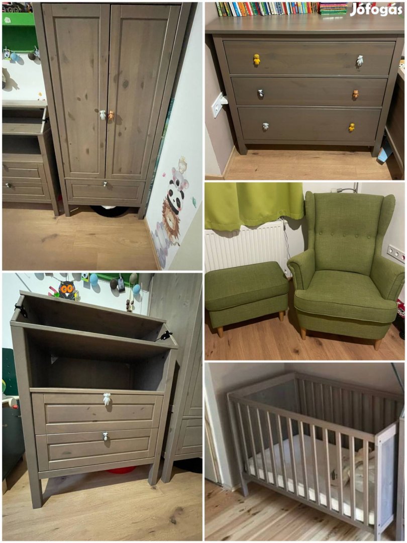 Eladóvá vált kisfiam babaszobájában használt komplett bútor. IKEA bútor, már nem kapható szürke-barna színben, nagyon szép állapotban.
