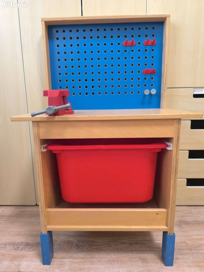 Eladó a képeken látható fa barkácsasztal játéksatuval, Trofast tároló dobozzal és játék szerszámokkal.