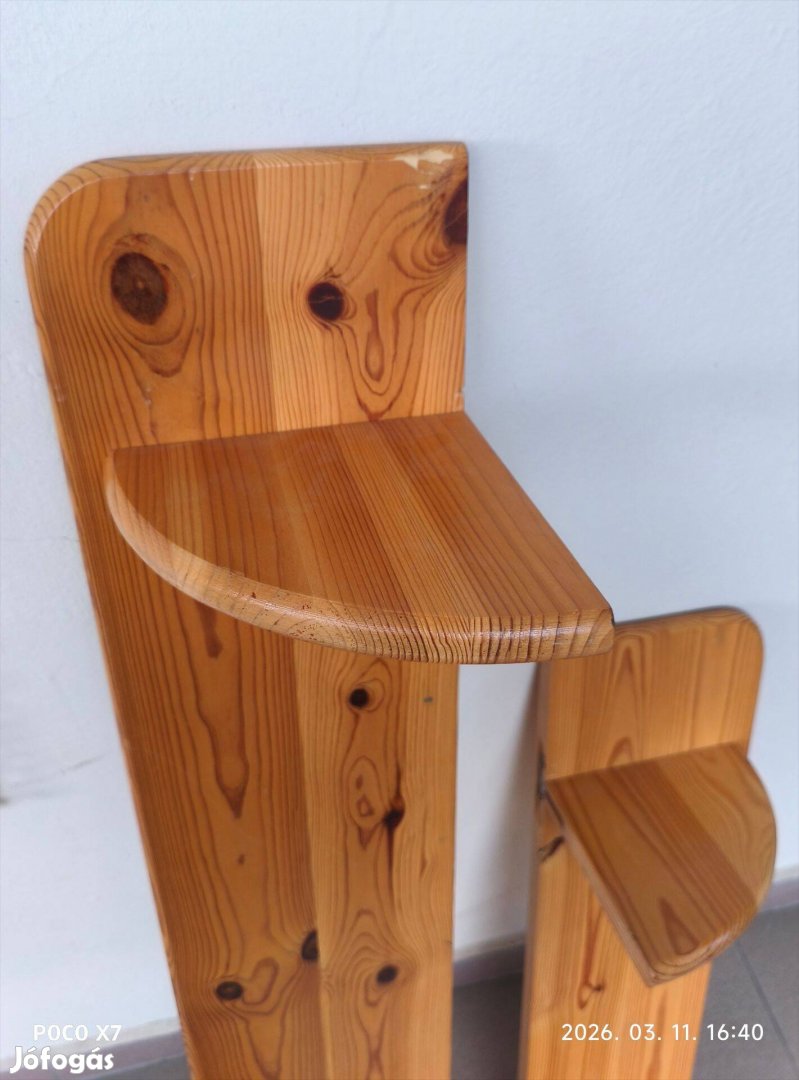 Akár külön-külön is eladó! Natur lakkozott, íves élű és formájú, szépen csiszolt fenyőfa falipolcok. Az egyiknek az élében apró kitörés van. Kampós szegre vagy csavarra akasztható, nagy teherbírású. A két egység keresztmetszete azonos: 20 cm széles a polc, össz. 20 cm magas a konzollal együtt.
