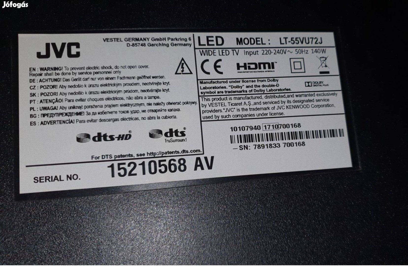 JVC LT-55VU72J LED tv törött alkatrésznek mainboard elkelt 17IPS72