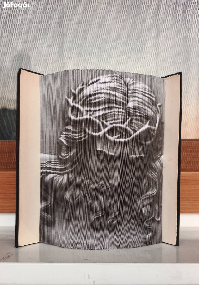 Jézust ábrázoló könyvszobor fotócsikokkal