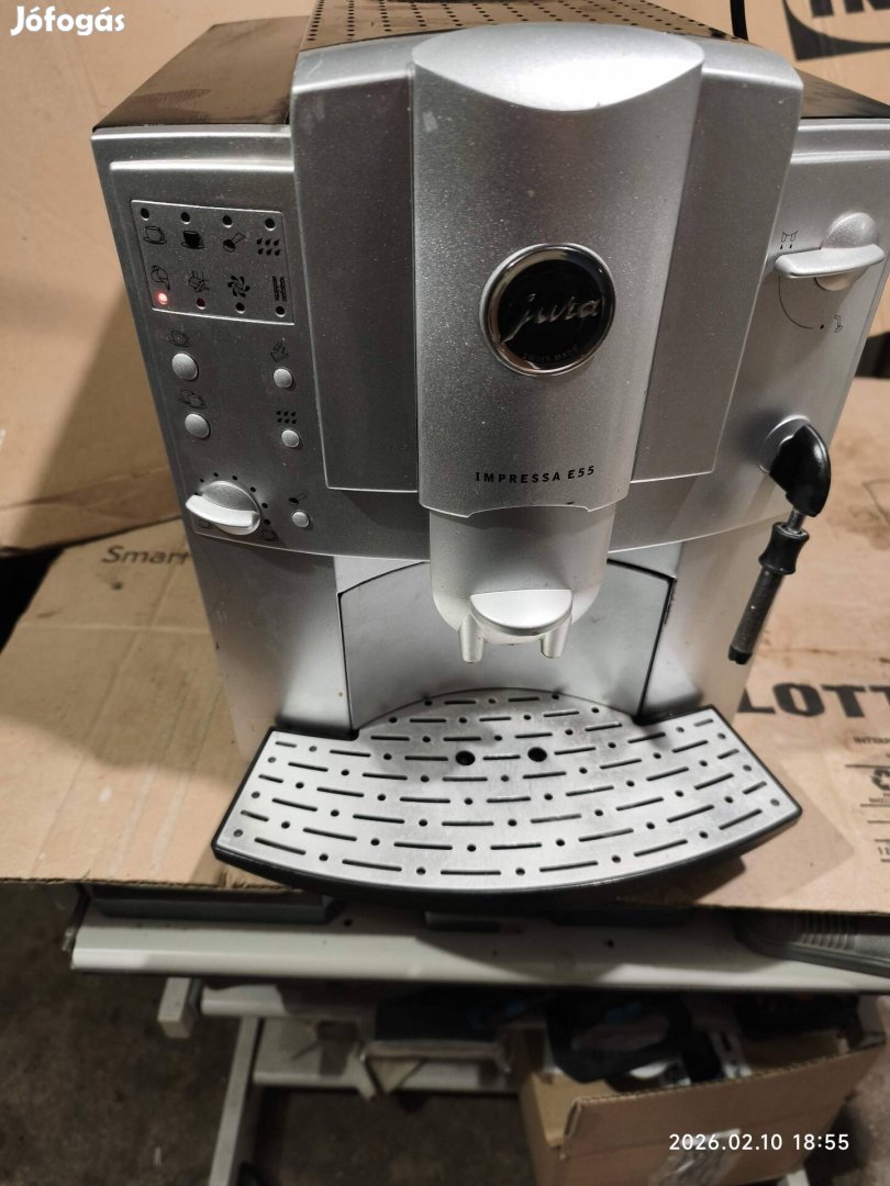 Eladó a képeken látható használt, nyers állapotú Jura E55 kávéfőző, bekapcsol, kávétfőzni nem tudtam vele, javításra, alkatrésznek.