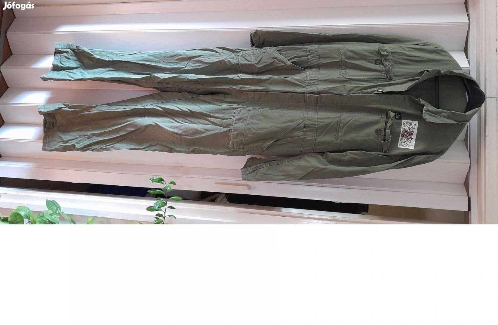 Khaki színű, elöl gombos overall. Néhány folt van rajta.