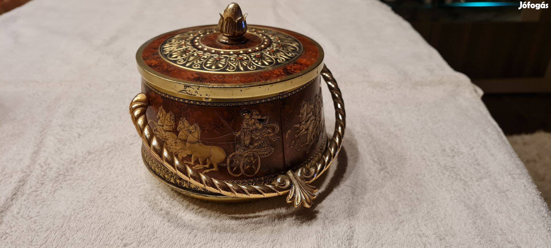 Eladó egy a 40-es évekből származó, lemezből készült, dombor mitázatú indiai süteményes, vagy egyéb tárolásra alkalmas doboz.