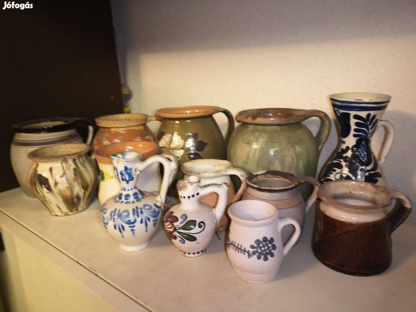 A képen látható kerámia gyűjtemény népi motívumokkal díszített kancsókat, korsókat és váza-szerű edényeket tartalmaz, amelyek ára jellemzően a koruktól, állapotuktól és származási helyüktől függ.