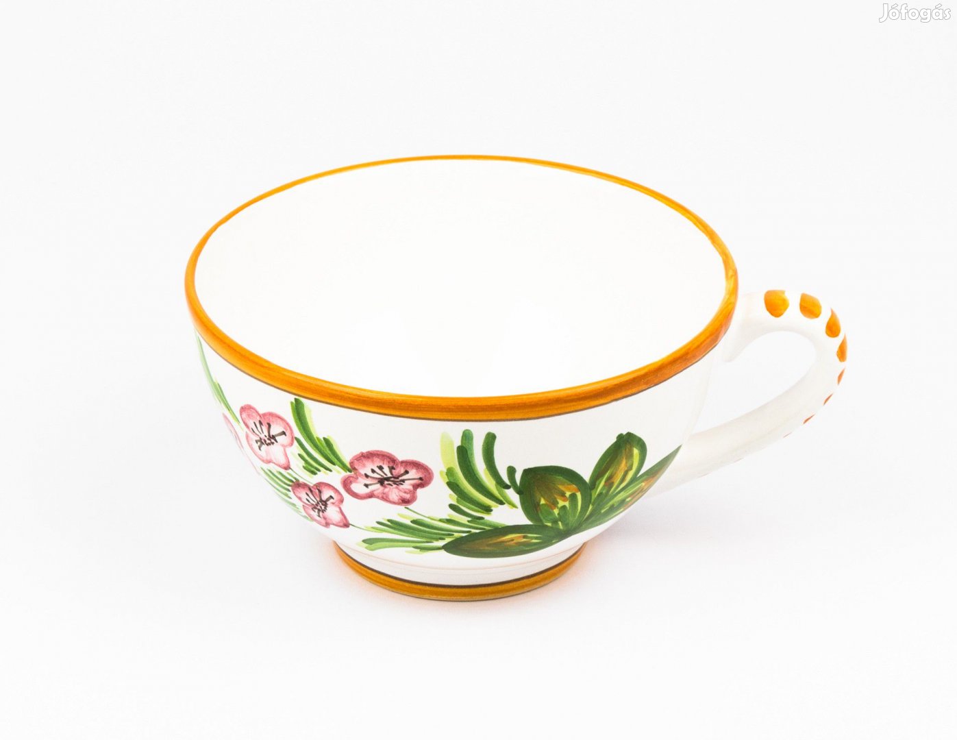 Kézi festésű kerámia tálka, füles leveses csésze, kb 14,5 cm átmérőjű, 8 cm magas.