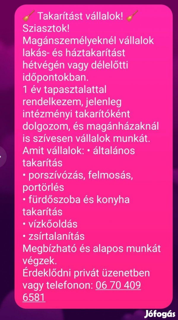 1 év tapasztalattal rendelkezem, jelenleg intézményi takarítóként dolgozom, és magánházaknál is szívesen vállalok munkát.