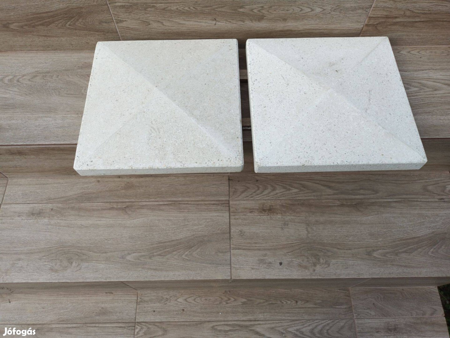 Műkőből készült kerítés pillér fedkő. 35 x 35 cm -es fehér színű, matt csiszolt felülettel. 3,5 cm lapmagasság, 5 cm csúcsmagasság.