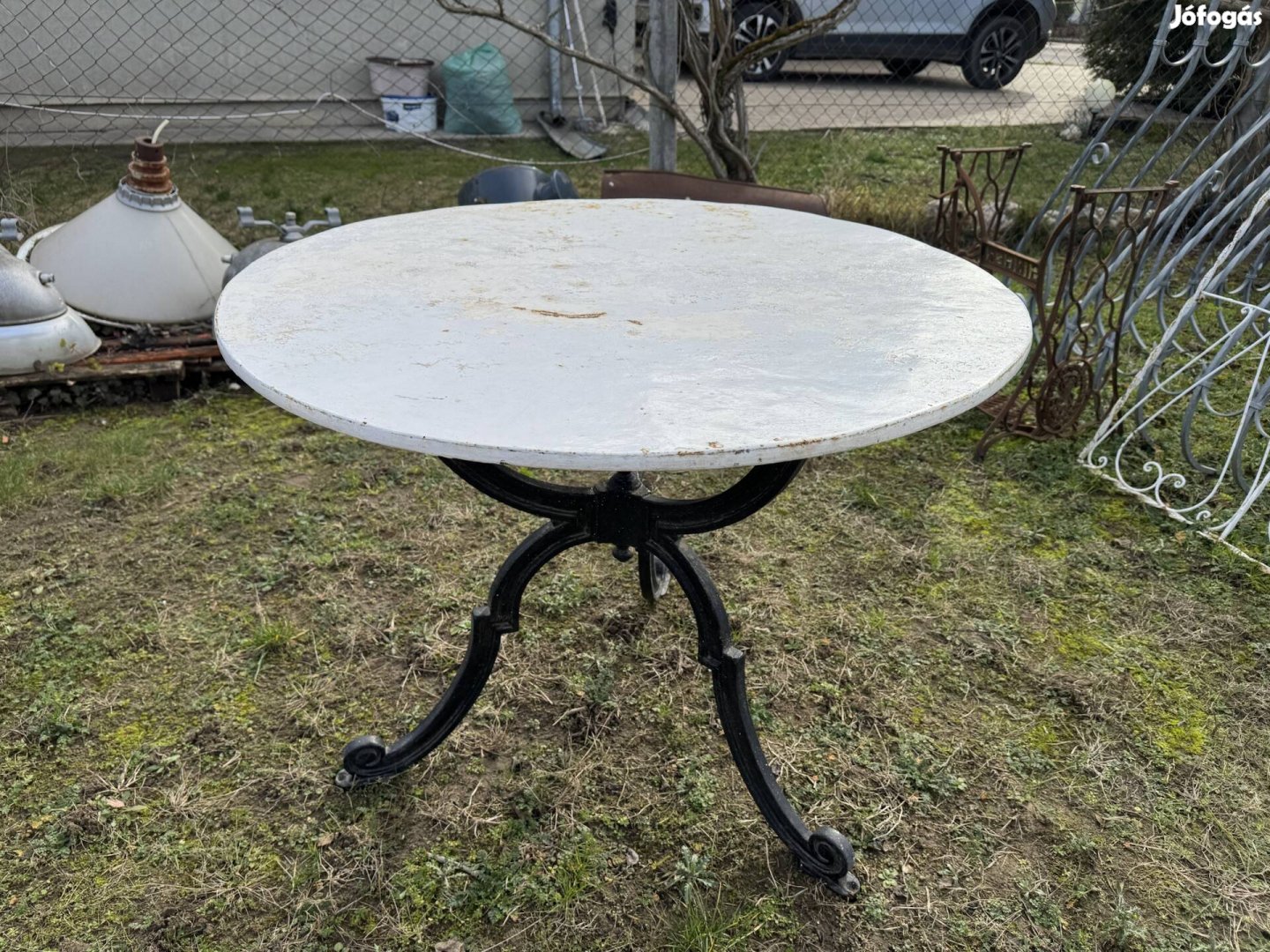 Hibátlan öntvény láb, lemez 95- cm.átmérőjű, tető, 75.-cm. magas. Masszív erős, díszes lábak. Személyes átvétel. Nem billeg, mivel három lábú.