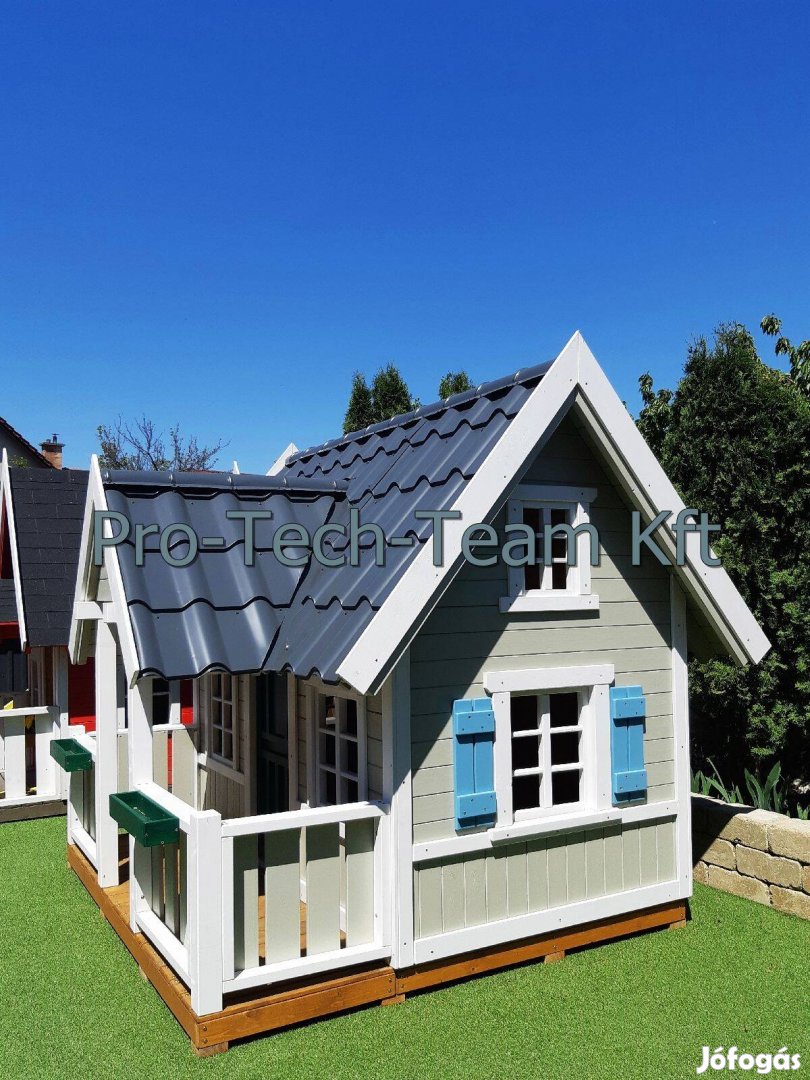 270x160 cm kisház tornáccal előtetővel mely 270x230 cm-es dobogón helyezkedik el, ajtóval , 4db fix és 2 db nyitható ablakkal ára 970000 ft