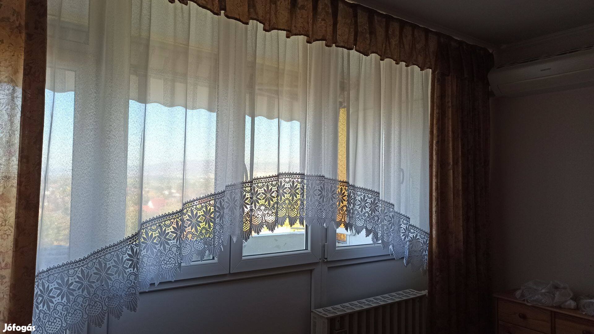 Eladó a képeken látható 30 cm-es pamut csipkével szegett panoráma függöny. Mérete: az anyag szélessége: 4 méter a függöny teljesen behúzottan: 240 cm a leghosszabb magassága: 170 cm a legrövidebb magassága: 130 cm csipke az alján: 30 cm a függöny nem szakadt, nem foltos, szép állapotú.