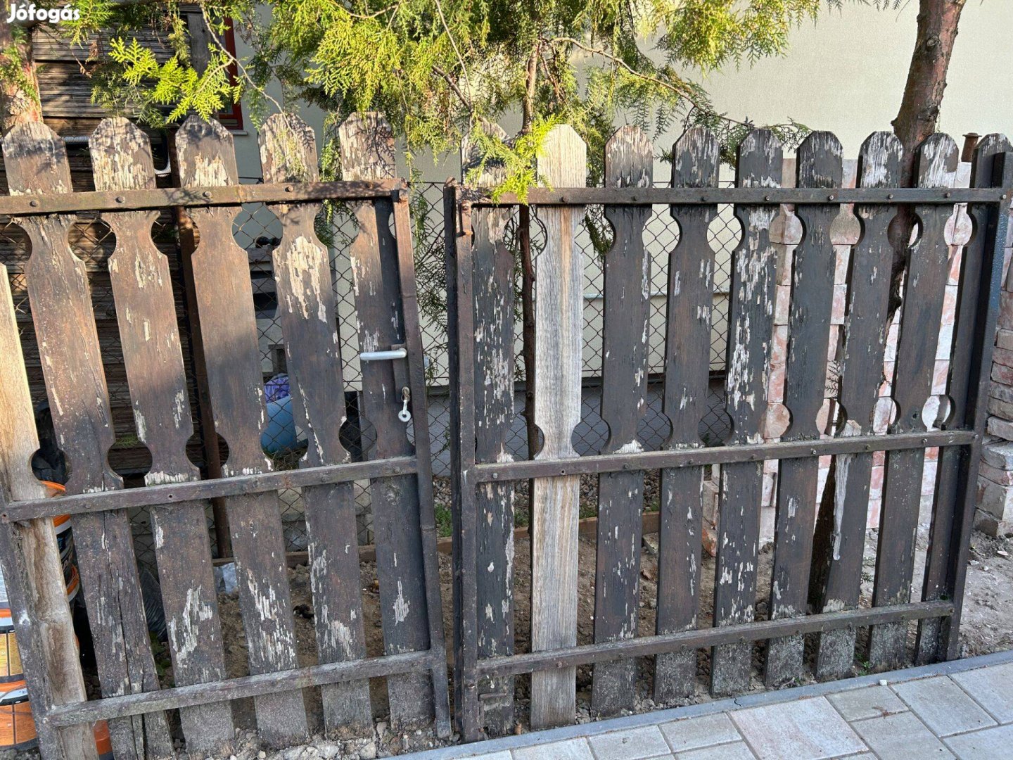 Kétszárnyú, aszimetrikus kapu, erős zártszelvény szerkezet, zárral együtt. Lécek már viseltesek, de tudok adni 2-3 csere lécet. Méret: 100cm x 155 cm és 150cm x 155cm