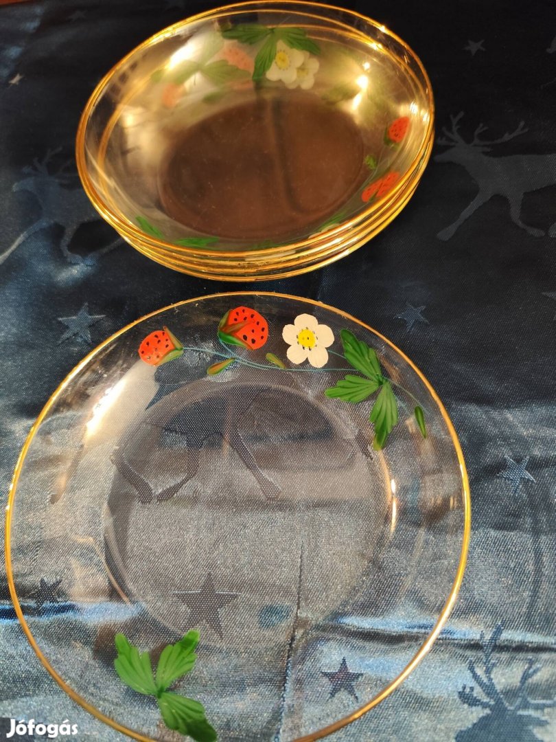 Eladó egy kézzel festett, epres mintás üvegtálka, amely a Salgótarjáni Síküveggyár retró kompótos készleteinek része.