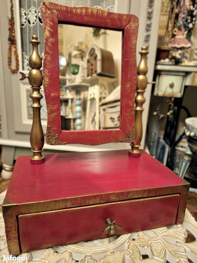Gyönyörűen felújított, asztali tükör, fiókkal. A tükör része új, a karcos régi, foncsorhibás helyett újat vágattunk bele. Dekorációnak vagy használatra, saját célra vagy ajándéknak, mind mind kitűnő ötlet.