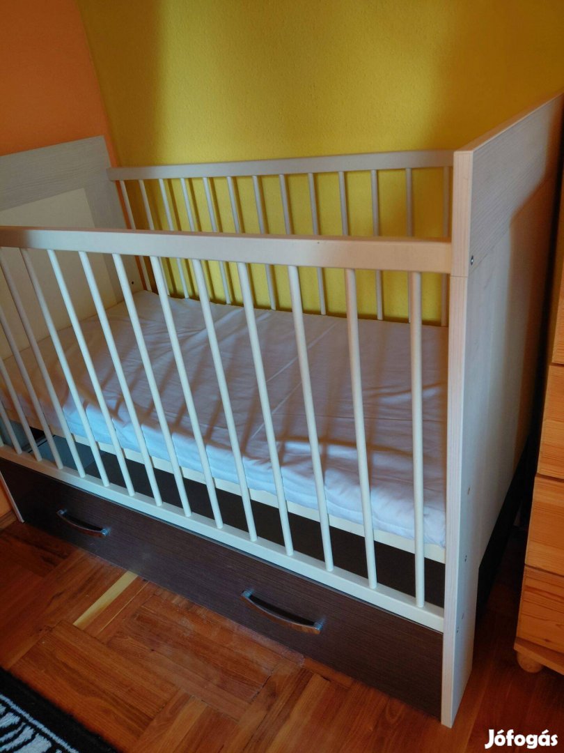 Eladó a képen látható ágyneműtartós kiságy, megkímélt állapotban kókuszmatraccal. Állítható magasságú, a baba korának megfelelően.