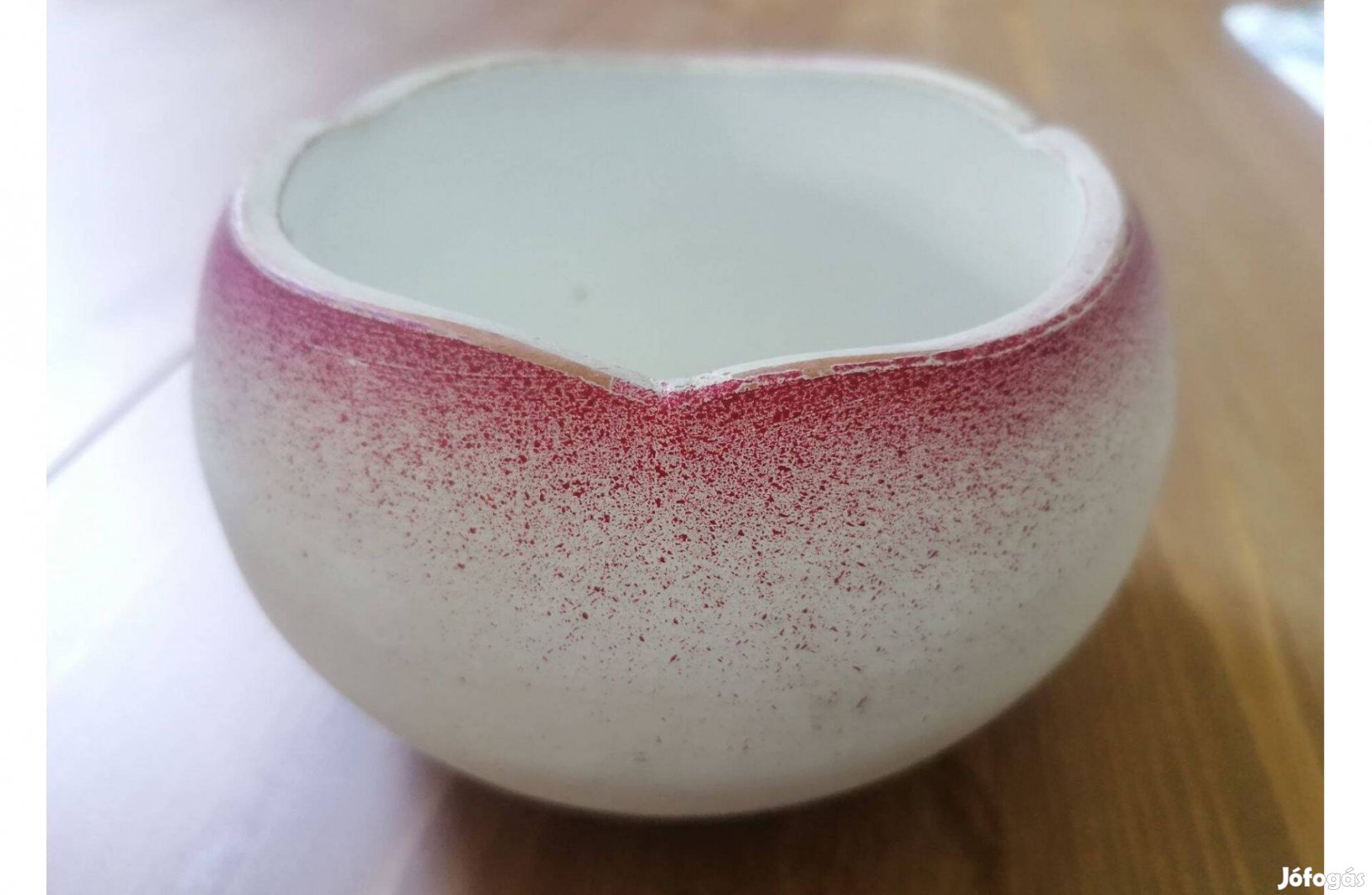 Fehér, hullámos tetejű kaspó, bordó, szórt festéses szegéllyel.