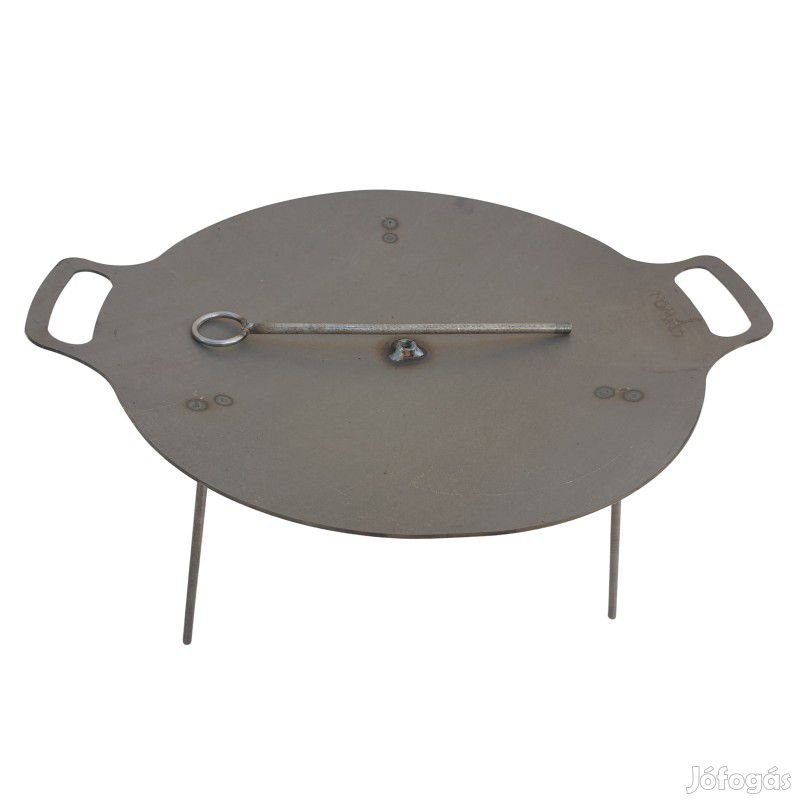 Kétfunkciós, kb 50 cm átmérőjű 3 mm vastag vas sütőtárcsa, 3 lábbal és függesztékkel, bogrács állványra is akasztható. A bográcsállványt az ár nem tartalmazza, az külön vásárolható meg.