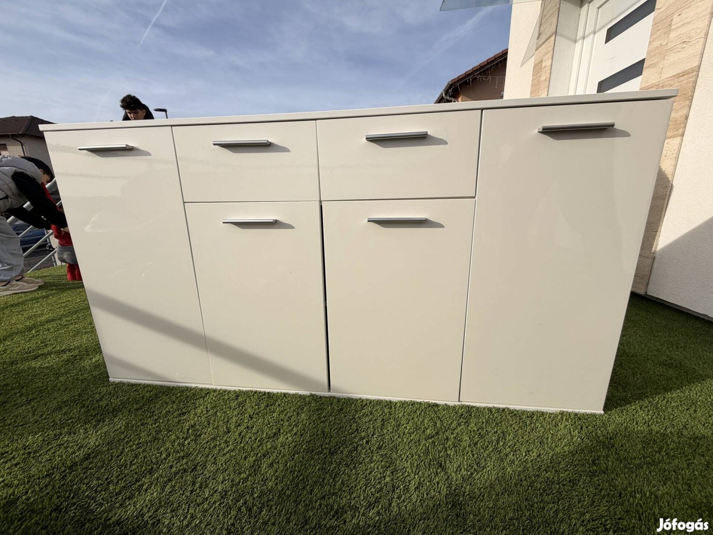 Eladó komód, magasfényű fehér színben. Használt. Mérete: 160 cm x 45 cm x 85 cm.
