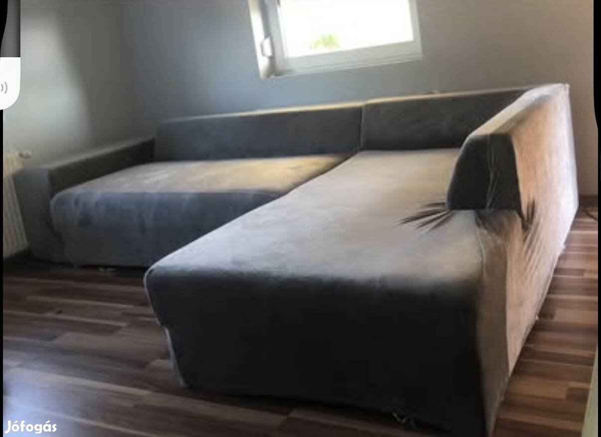 Eladó egy nagyméretű L alakú kanapé. Az eredeti oldalsó bőr kopása miatt ( fotózva) szürke huzattal. Az egyik ülő rész alatt ágynemű tartó is található. A 3 nagyméretű párna is tartozék, bár 2 párna huzatnak a cipzárja javításra szorul. Pakolásban, szállításban nem tudok segíteni.