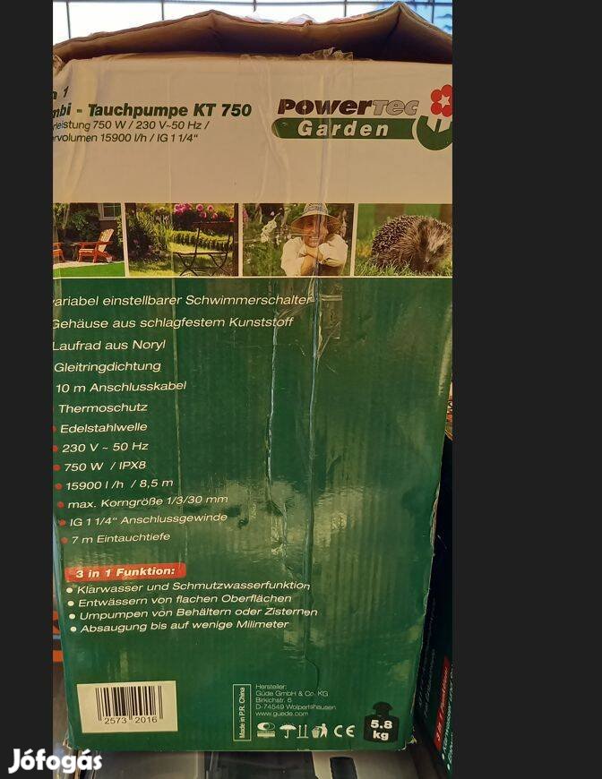 Powertech Garden 15900liter/ óra vízhozammal, 750W-os motorral, max. 8, 5 méteres tolási magassággal, 10 méteres vezetékkel, 3 az 1- ben szivattyú, lapos, tiszta víz és szennyvíz szivattyúzására is alkalmas, intelligens búvárszivattyú, garanciával eladó.