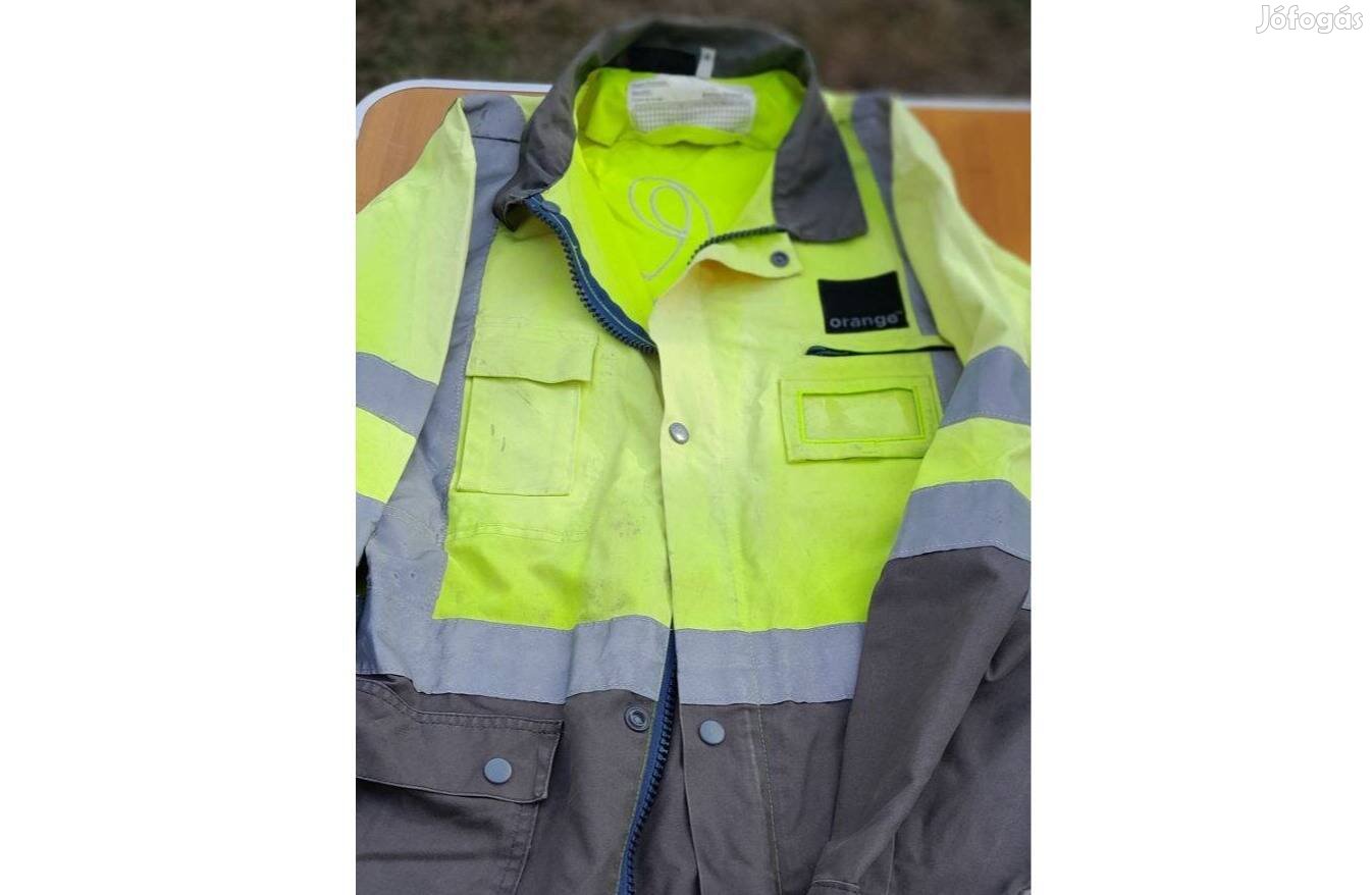 Szürke-sárga béleletlen kabát. Láthatósági csíkkal, elöl végig zippzáras. Orange márka, zsebekkel.
