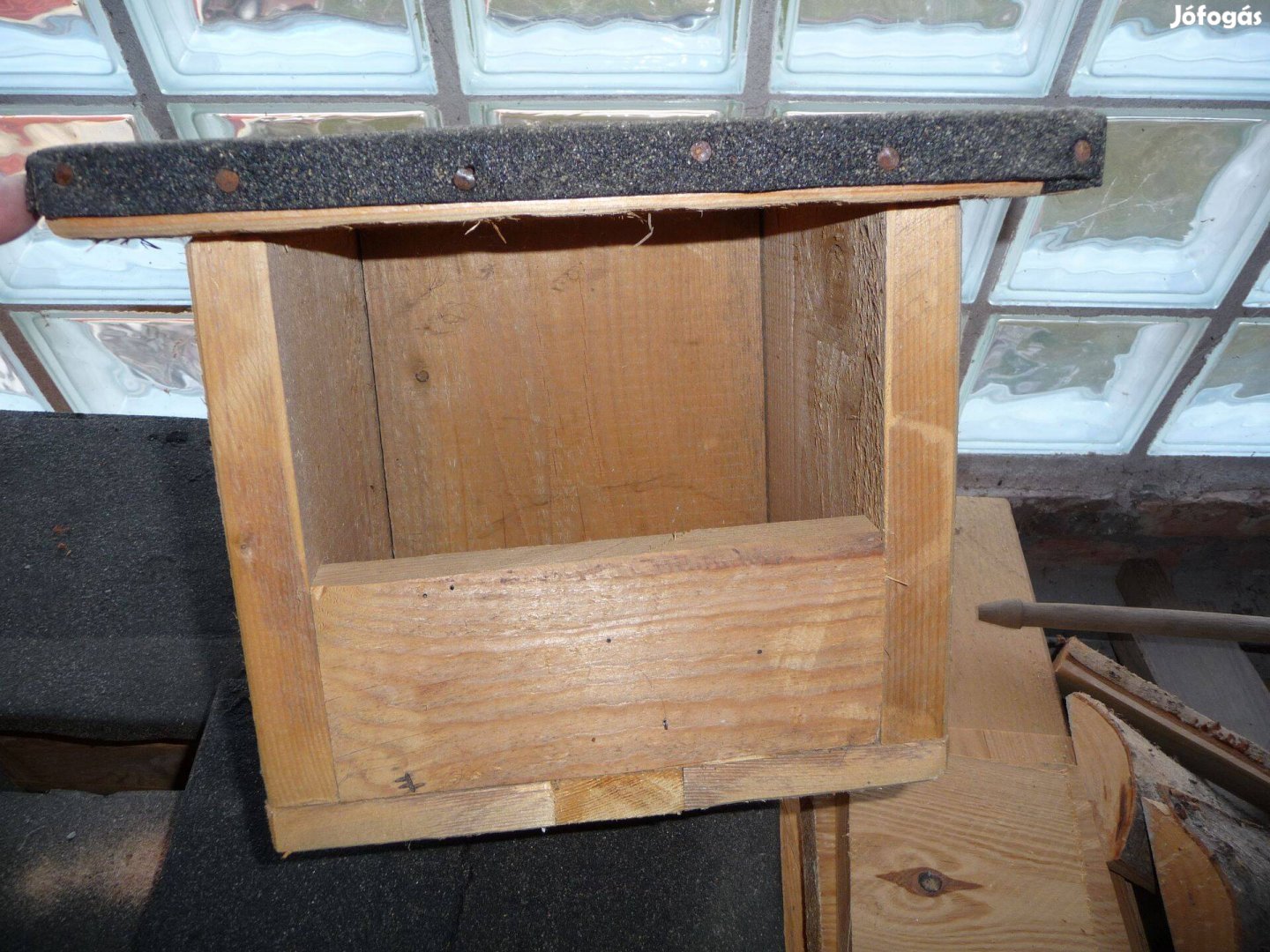 A fotók szerinti "C" típusú, kezeletlen fenyődeszkából készült rozsdafarkúak-billegetők-és rigófélék számára ajánlott kátránylemez tetőborítású odúk eladóak.