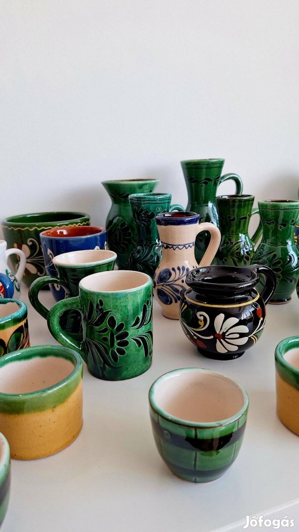 Magyar népi mázas kerámiák a 80-as évekből, bögrék, kancsók, vázák, fali akasztók, tányérok. Köztük kézzel festett mezőtúri kerámiák is megtalálhatóak.