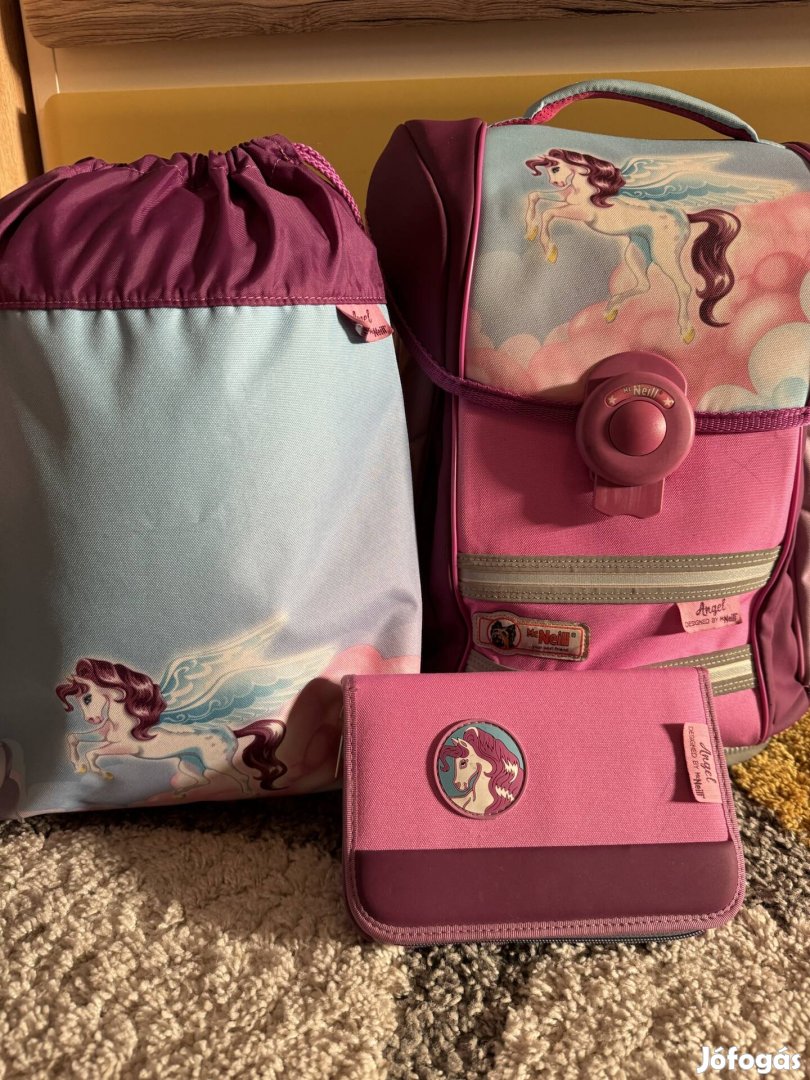 Mcneill ergonómikus iskolatáska szett, pegazus mintával (világoskék, pink, lila). Világítás bekapcsolható a hátizsákon, 3 fokozatban a mérete is állítható. Sok praktikus tároló rekesszel rendelkezik. Testnevelésre tornazsák, és tolltartó is a szetthez tartozik. Sajnos már újonnan az egyik oldali cipzár sérült volt, ott azon az egy helyen elakad a cipzár, befotóztam közelről. Mi így is imádtuk, a másik oldalon a kulacs s befér úgy, hogy be is lehet cipzárazni.