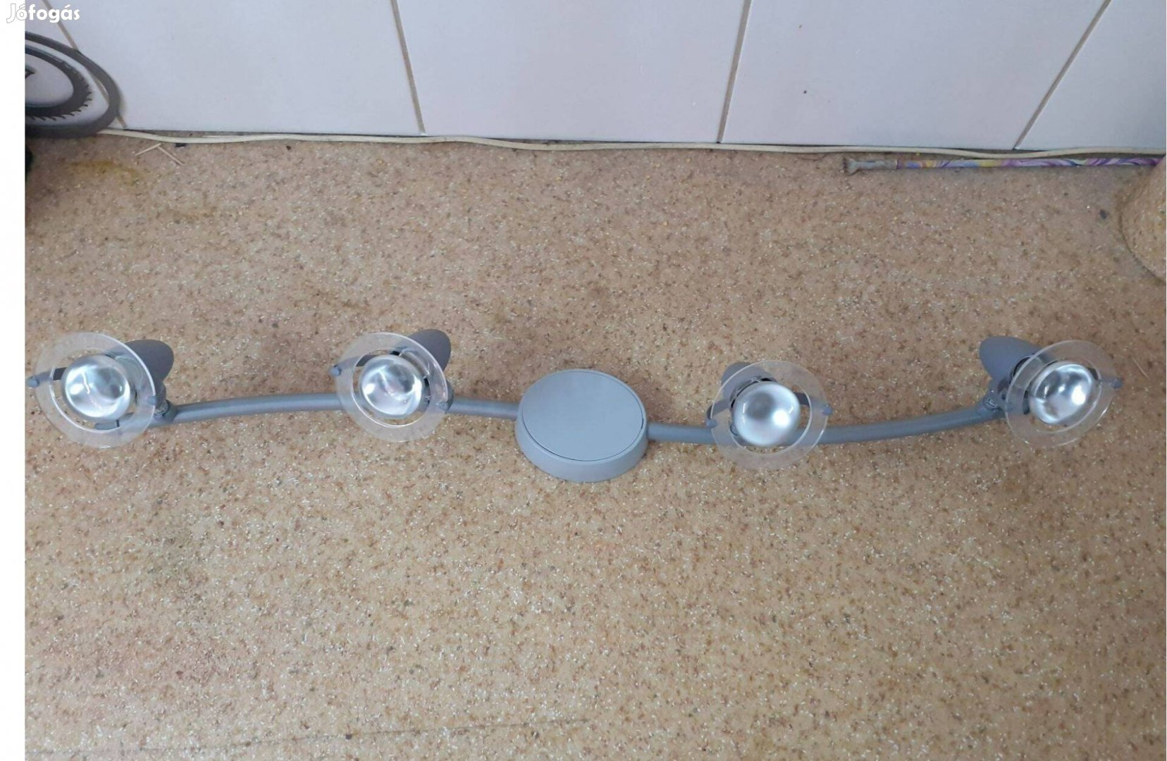 4 égős mennyezeti spotlámpa. Szürke matt bevonattal, enyhén ívelt tartórúd, 4 db tetszőleges irányba állítható lámpával. Átvehető csak személyesen a megbeszélt időben és helyen.