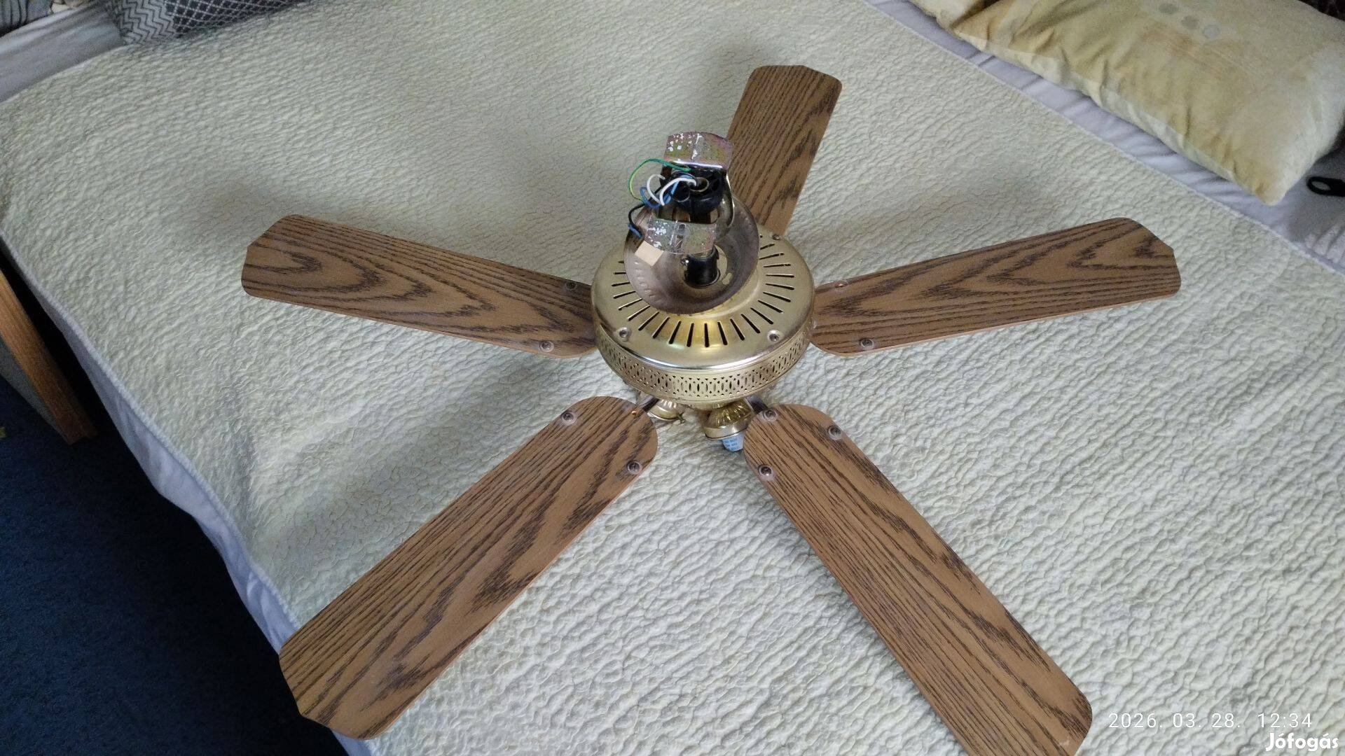 Ingyen elvihető mennyezeti ventilátor lámpa,, alkatrésznek vagy felújításra. Műszakilag jó villany szerelő szerint., viszont az egy vagy kettő lapát törött sajnos.. Kézzel forgatva a lapátok nem akadnak, szépen forog. Nem használom. Nem szeretném kidobni.