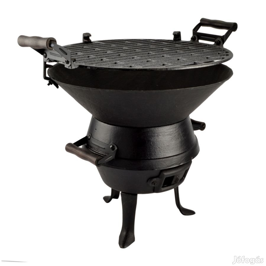 Mérete: 35 cm rács átmérő; 45,5 cm széles fülekkel együtt; 38 cm teljes magasság; 10 cm láb magasság