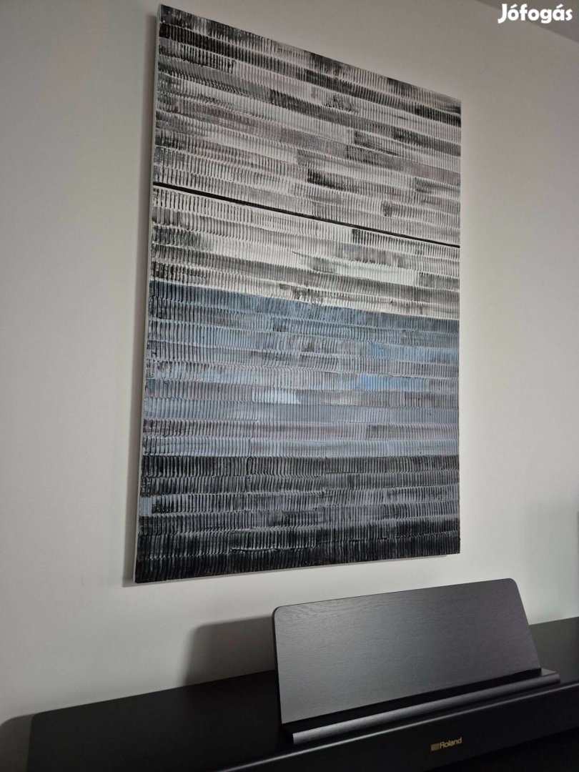 Eladó egy egyedi megjelenésű, 80x120 cm-es modern absztrakt festmény. A kép különlegessége a látványos, vízszintes irányú 3D textúra, amely mélységet és karaktert ad a térnek.